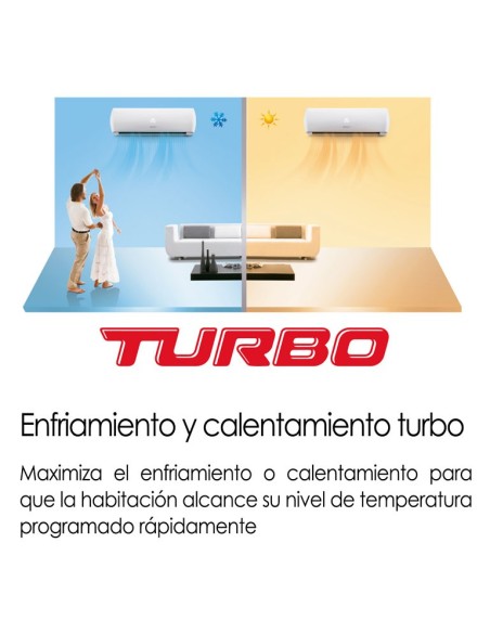 Aire Acondicionado tipo split con Tecnología ON/OFF, color blanco con visor LED invisible y 36 meses de garantía. Incorpora nueva tecnología Golden Fin (Anticorrosión) que protege su equipo de la intemperie y elementos corrosivos, , tubería de cobre de 3 metros incorporada y 3 metros en cables eléctricos, compresor con tecnología japonesa con turbo enfriamiento y calentamiento (Frio/Calor), deshumidificador independiente y protección contra el aire frío, interruptor temporizador, filtro lavable que incluye 1 filtro adicional (HEPA) y gas ecológico R410a para facilitar la instalación y mantenimiento del equipo cumpliendo altos estándares internacionales.