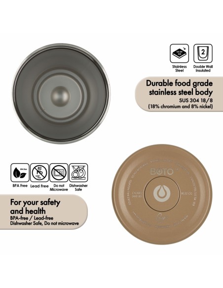 • Material: Cuerpo de acero inoxidable SUS 304 (18/8 - 18% cromo y 8% níquel), libre de BPA y plomo, para tu seguridad y salud.