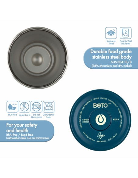 • Material: Cuerpo de acero inoxidable SUS 304 (18/8 - 18% cromo y 8% níquel), libre de BPA y plomo, para tu seguridad y salud.