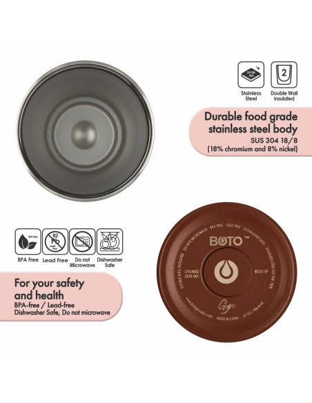• Material: Cuerpo de acero inoxidable SUS 304 (18/8 - 18% cromo y 8% níquel), libre de BPA y plomo, para tu seguridad y salud.