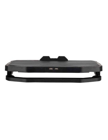 Su superficie es de metal, facilitando la disipación del calor. Dispone de 4 ventiladores con LED azul para mayor capacidad de refrigeración. Dos puertos USB para conexión, ajuste de altura para mayor comodidad y mejor visibilidad de tu Laptop, además del soporte de soporte para evitar que la laptop se caiga.